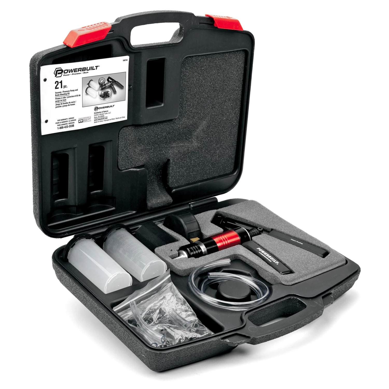 Servicing your vacuum operated components and hydraulic systems has never been easier. The Powerbuilt 21piece Vacuum Pump Kit is an essential tool for checking vacuum-operated automotive components, bleeding air from hydraulic systems, and siphoning fluids. This multi-purpose pump creates both pressure and vacuum. Includes integrated vacuum/pressure release mechanism. The kit also includes an assortment of adapters, a roll of plastic tubing, and 2 fluid reservoirs making it easy to connect the pump to various automobile components. Once connected, the integrated dual scale vacuum/pressure gauge tells you when the proper amount of vacuum has been reached. The Kit includes a heavy-duty carry case with usage photos and detailed instructions.