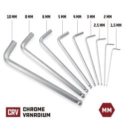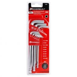 The Powerbuilt 9 Piece Metric Long Arm Hex Key Wrench Set is a top-quality long arm metric hex key wrench set offering strength, precision, and organization. Each wrench is constructed of premium chrome vanadium steel for durability and precise fit into hex head fasteners. For added versatility, each wrench features a ball end to allow turning hex fasteners from angles up to 25 degrees from vertical. The longer arms have a longer reach and can generate more torque. Set includes common wrench sizes 1.5mm, 2mm, 2.5mm, 3mm, 4mm, 5mm, 6mm, 8mm, and 10mm. The 9 metric hex key wrenches are organized with size markings inside the included plastic carrier you can hang on pegboard or toss in a toolbox. Powerbuilt products meet or exceed ANSI standards. Dependable enough to last a lifetime.