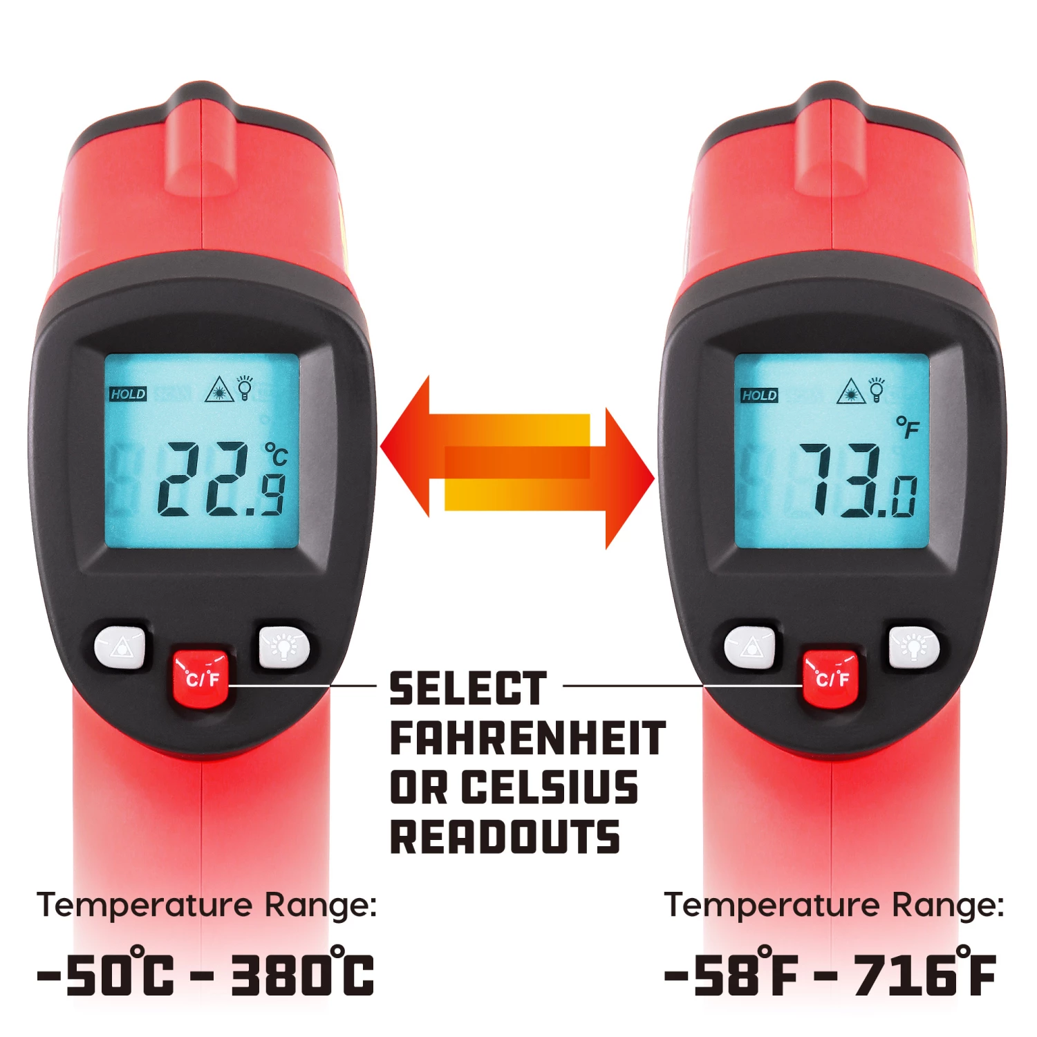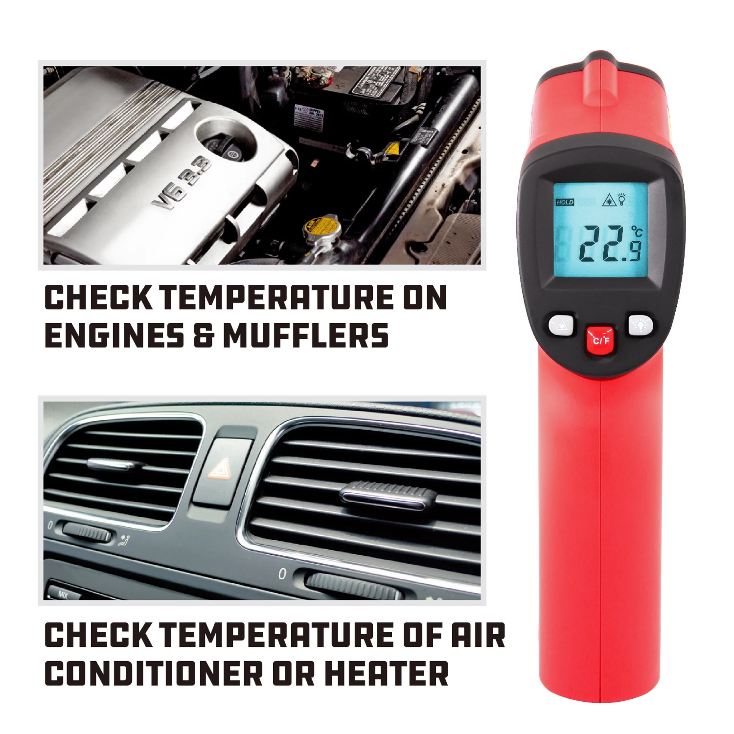 Getting accurate temperature readings on engines, exhaust systems, wheel bearings, brakes and more is safer and easier with this quality laser-guided Powerbuilt Infrared Thermometer. It’s quick, just point the laser guide at the object to be measured and see the temperature displayed on the easy-to-read digital screen. With an 8-to-1 distance to spot ratio, you can take pinpoint temperature readings from a distance, a great safety and convenience feature for measuring dangerous or out of reach surfaces. This compact unit measures and displays temperatures in Fahrenheit from -58 to +716 degrees or in Celsius from -50 to + 380 degrees. It’s built to last using quality components and precision electronics with an accuracy of +/- 2%. The battery is included. NOT FOR MEDICAL USE.
