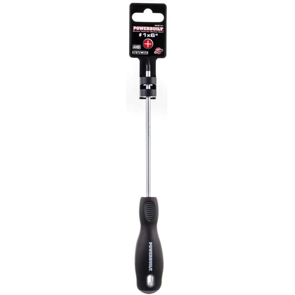This line of Powerbuilt screwdrivers feature drivers that are built with premium double-injection Trilobular handles for maximum comfort and grip. Shafts are constructed of (SVCM) Silicon Vanadium Chrome Magnesium alloy Steel for added durability and torque. Large size drivers have hex bolsters, and sizes are marked on the handle caps for easy size identification. All drivers exceed ANSI specifications for quality and performance.