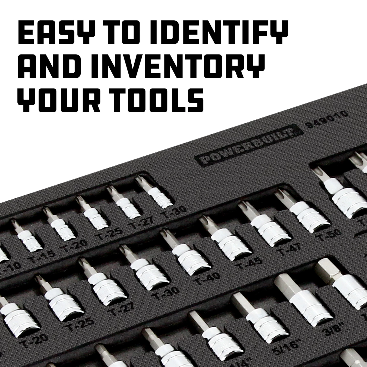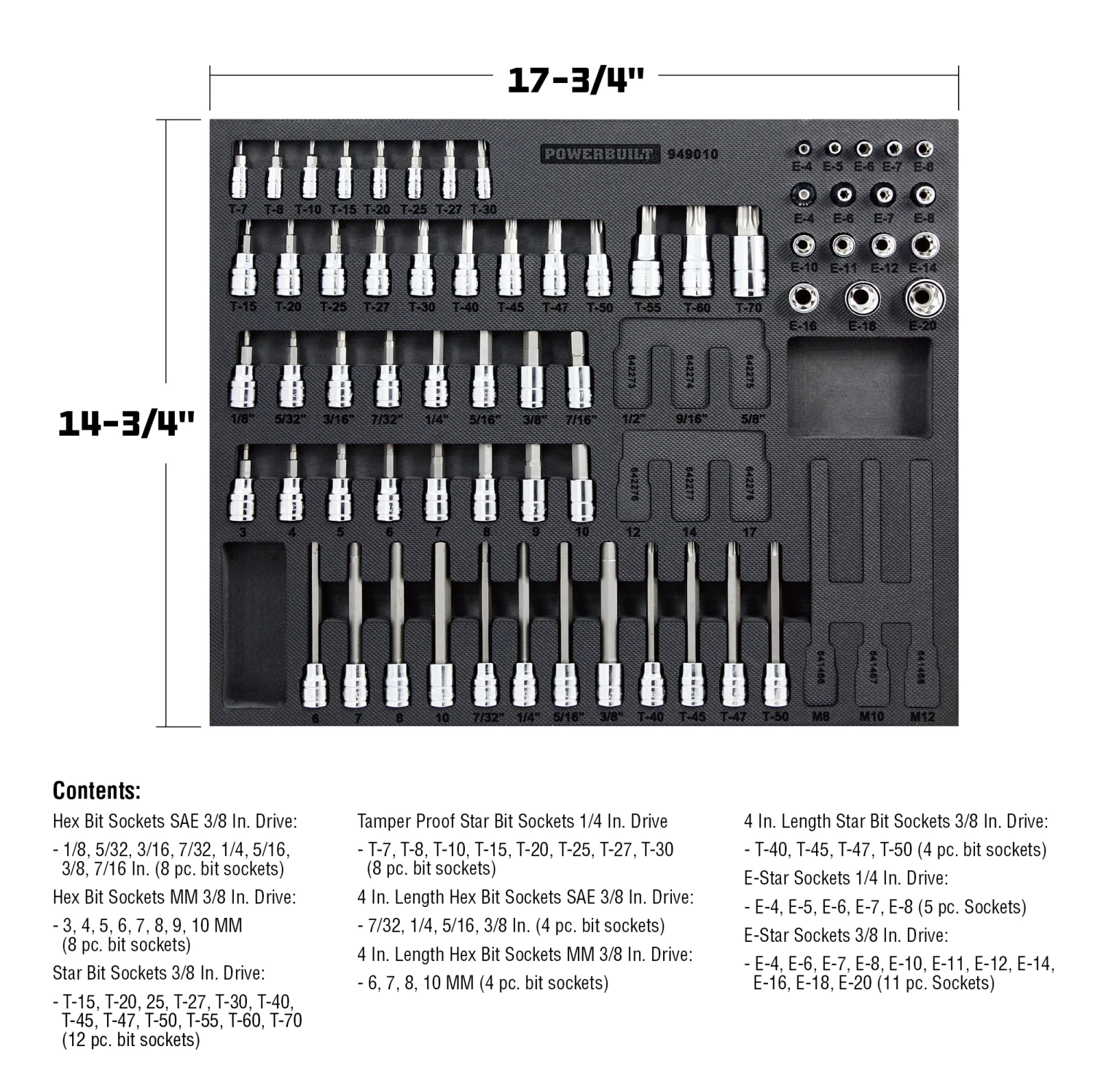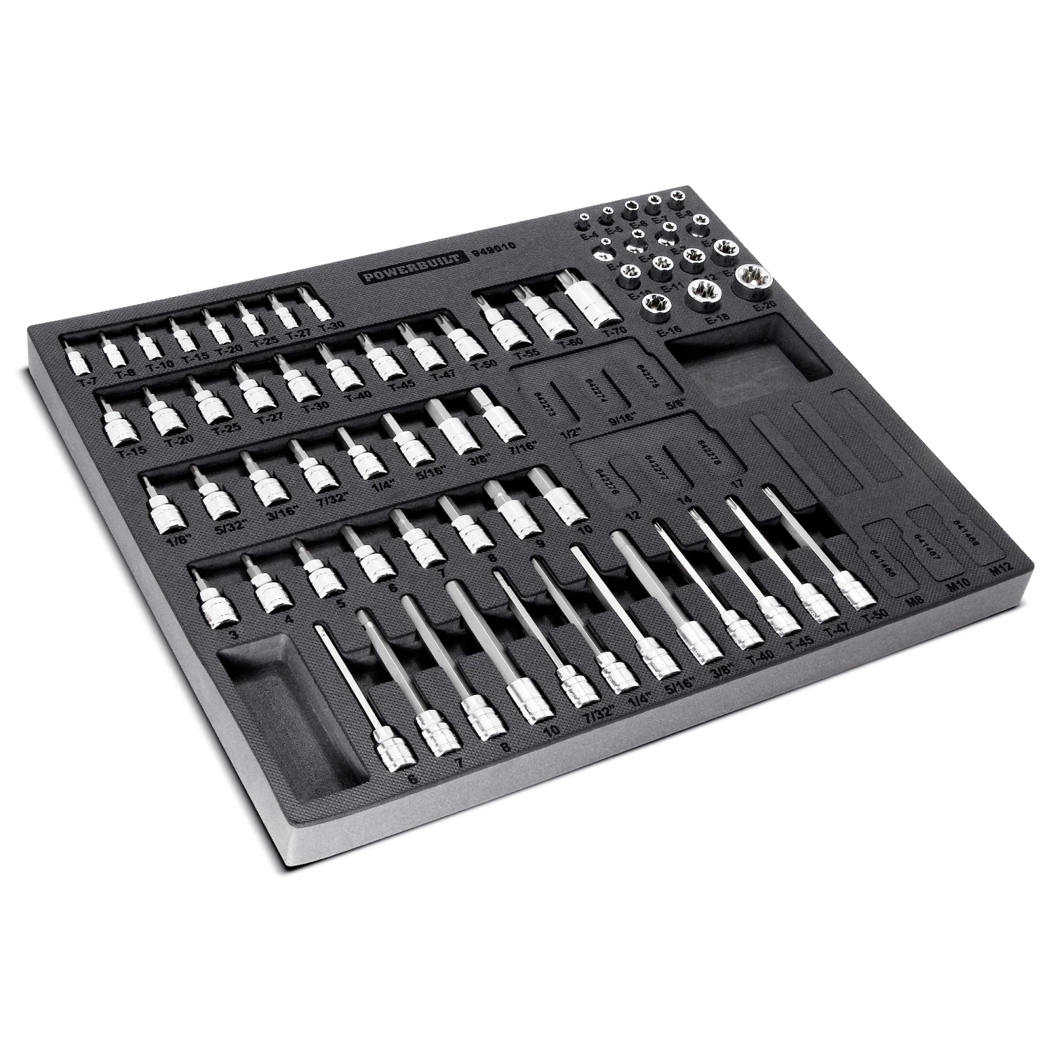 Powerbuilt Professional Technician socket sets are built to meet or exceed ANSI specifications. All sockets are constructed of high-grade chrome vanadium steel with hardened S2 steel bits. Each socket is mirror polished and chrome plated for the highest degree of durability and corrosion resistance. Powerful, precise and stylish, Powerbuilt socket sets offer the look, feel and performance hard-working Techs deserve.