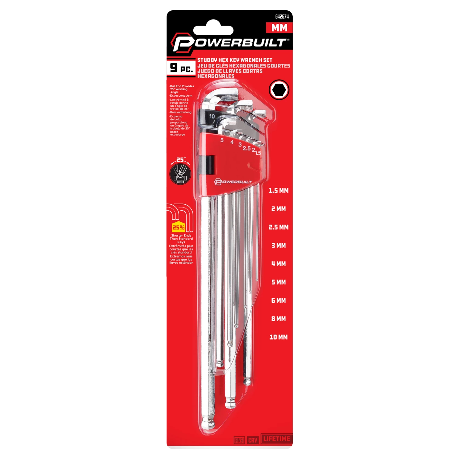 The top quality Powerbuilt stubby long arm metric hex key wrench set offers innovation, quality and durability. The stubby L-wrench ends fit in tight spaces where regular L-wrenches won’t. Extra long arms add leverage and feature a ball end for use at angles up to 25 degrees.