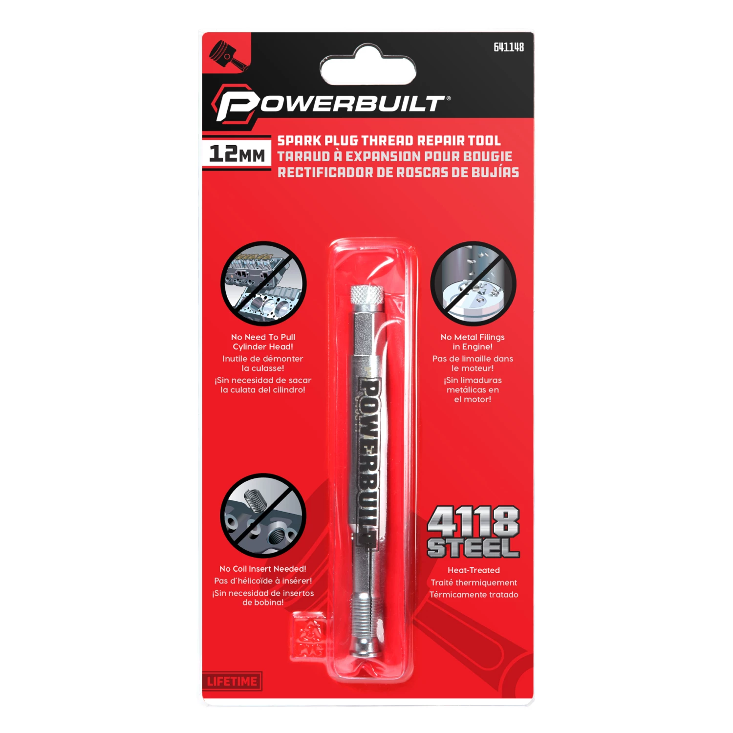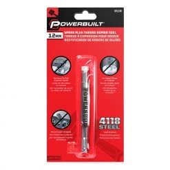 Do you have fouled damaged threads due to old spark plugs? You need to straighten those threads without dropping engine-killing metal shavings into your cylinders, or without removing the cylinder heads, and no risky thread inserts. You need Powerbuilt’s patented 12 Millimeter Back-Tap Thread Repair Tool to save time and possibly that engine. The Back-Tap’s patented collapsible design allows it to engage be placed through the spark plug hole and into the chamber. A mandrel is then drawn back, expanding the tool’s threaded area and threading into the clean threads at the bottom of the spark plug hole. The innovative Back tap repairs the damaged thread as it is drawn up through the spark plug hole, bringing debris and metal filings with it. Made in the USA. Meets or exceeds ANSI standards. Lifetime warranty.