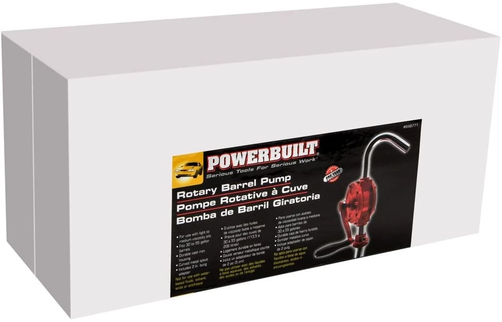 The Powerbuilt Rotary Barrel Pump is ideal for dispensing light to medium viscosity oils. Simply attach the included 2″ bung adapter to the lid of any 30 to 55 gallon barrel, then rotate the handle to dispense about 200cc of fluid per revolution. Note, the rotary barrel pump is not for use with water-based fluids, solvents, acids or antifreeze. Powerbuilt Tools are Serious Tools for Serious Work. Millions of Powerbuilt products are used every day around the globe, on the job, at home and in the garage. Powerbuilt tools are built with the performance, features, fit and finish to satisfy the most demanding users. No matter which Powerbuilt tool you select, you will enjoy the added confidence of knowing that all Powerbuilt tools and equipment meet or exceed applicable standards set by the US Government and American National Standards Institute (ANSI). Ready to get serious? Get Powerbuilt tools!