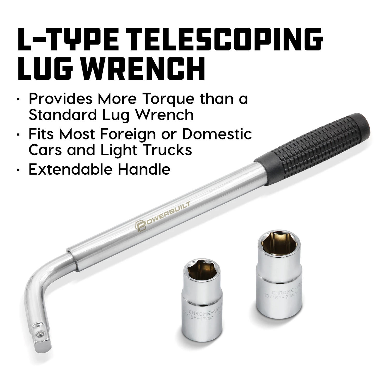 Here’s a better idea: a lug wrench with a telescoping handle for added leverage when needed and compact size for easier storage. The Powerbuilt version adds to the versatility by including two double-sided lug nut sockets to fit both SAE and metric lug nuts. There’s even a handy storage pouch to keep everything together in your trunk or truck box. Fits lug nut sizes: 11/16″, 3/4″, 13/16″ 7/8″, 17mm, 19mm, 21mm, 22mm.