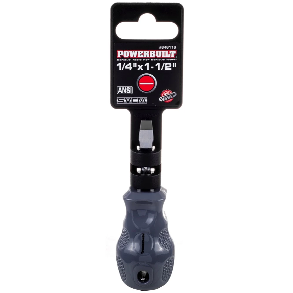 This line of Powerbuilt screwdrivers feature drivers that are built with single injection Acetate handles for maximum comfort and grip. Shafts are constructed of (SVCM) Silicon Vanadium Chrome Magnesium alloy steel for added durability and torque. Large size drivers have hex bolsters, and sizes are marked on the handle caps for easy size identification. All drivers exceed ANSI specifications for quality and performance.