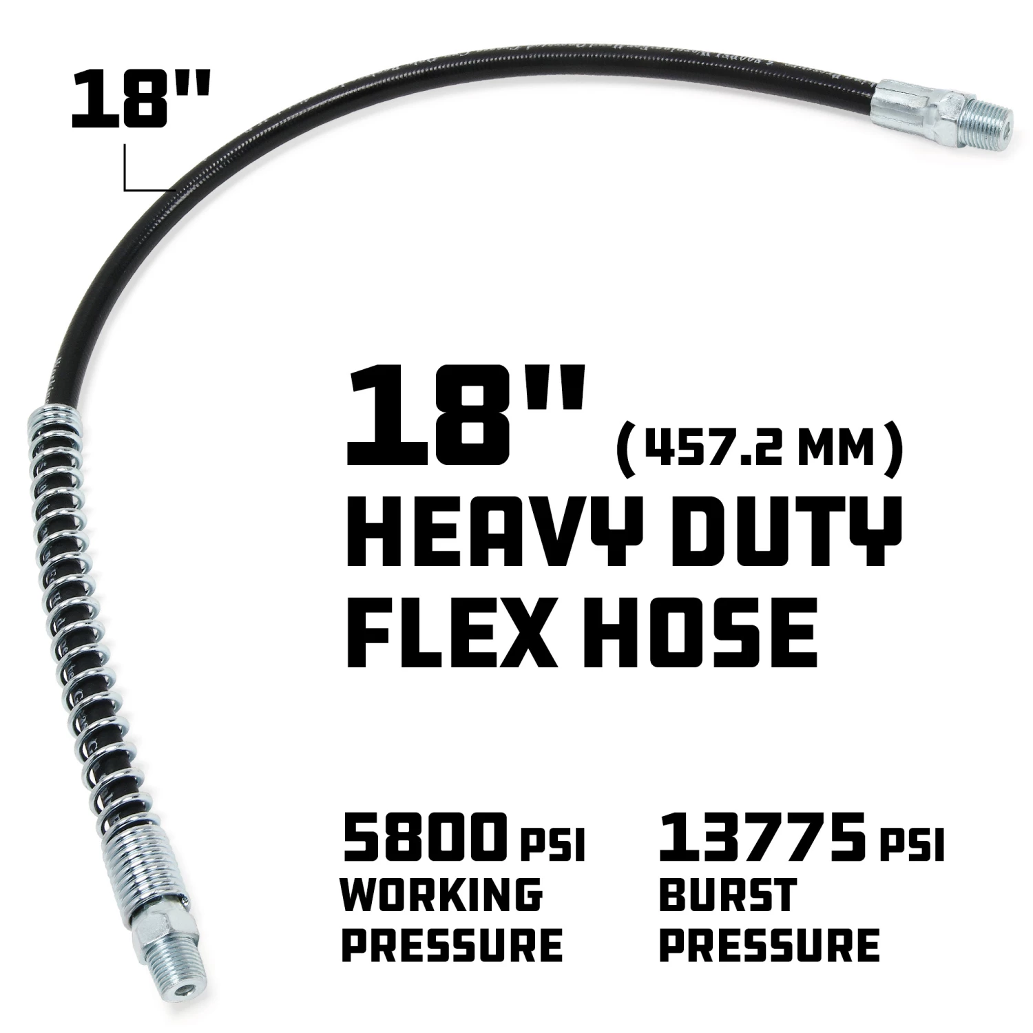 The Powerbuilt 18″ Heavy Duty Flex Hose includes a spring protector to resist kinking. Designed for a 5,800 PSI working pressure and burst pressure of 13,775 PSI.With a 1/8″ NPT thread, this connecting hose fits more hand-operated grease guns. Perfect for replacing your damaged or worn-out grease gun hose, or adding a foot-and-a-half of length to your grease gun for hard-to-reach fittings.