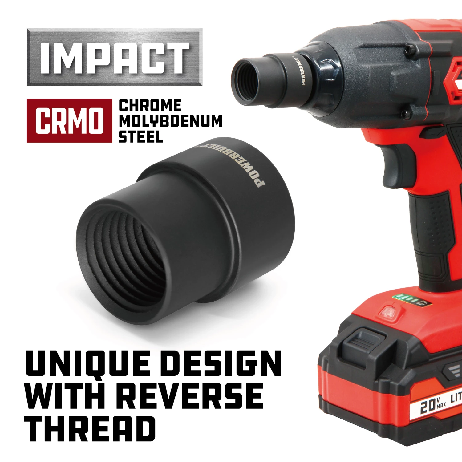 Powerbuilt 2 Pc. Emergency Lug Nut Rmover Set coming with 1/2 in. Drive 13/16 in and 1 in. Socket. For removing stuck and damage lug nuts in an emergency situation. These uniquely designed sockets with reverse threading inside can quickly and easily remove worn, stripped or damaged lug nuts when conventional tools are not getting the job done. The sockets works with your Air/Power Impact Wrench. Built of strong premium chrome molybdenum steel with a beautiful stealth black phosphate finish.