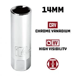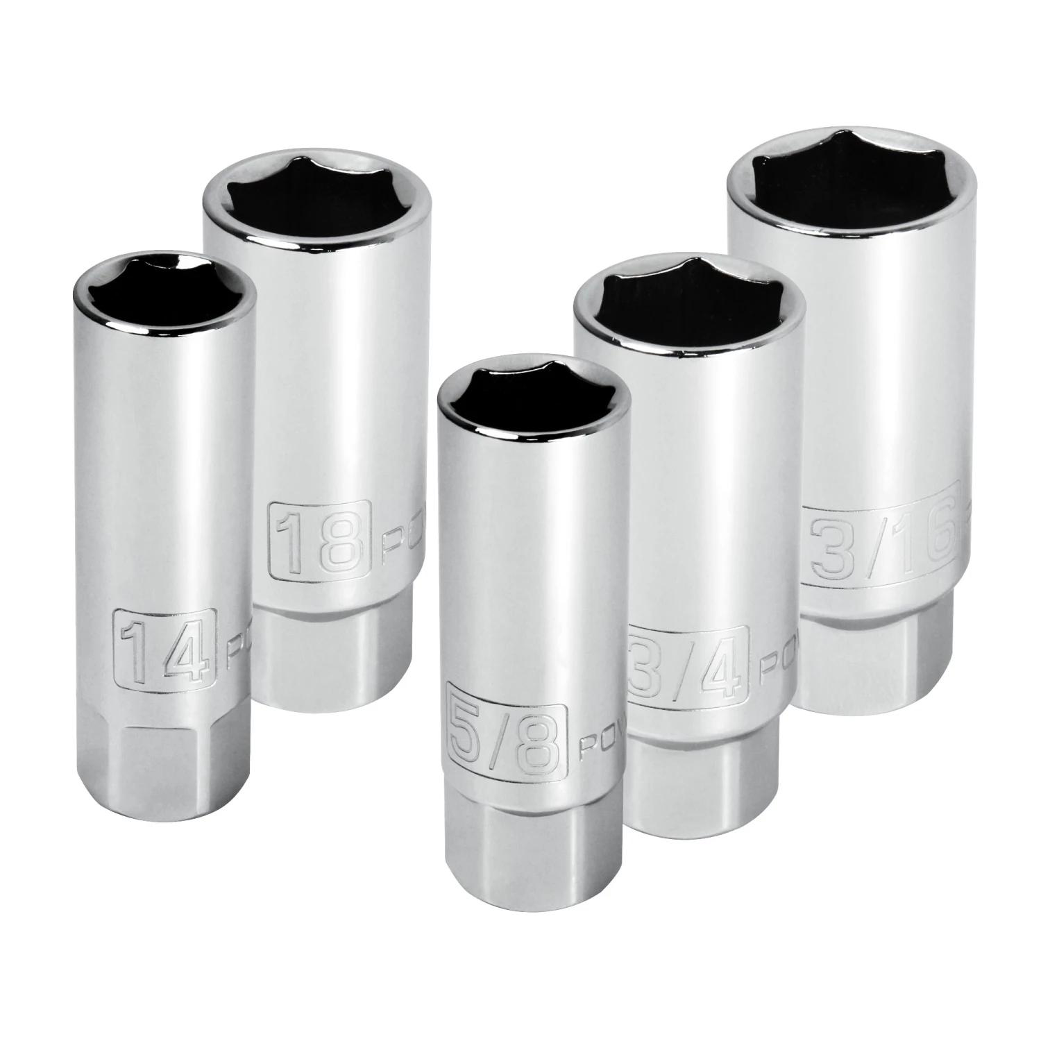 Spark plugs are unique. You need a strong tool to release stubborn stuck plugs yet a soft touch so you don’t do any damage. This 5-piece 3/8-inch Drive Spark Plug Socket Set offers a useful assortment of SAE and metric 3/8-inch drive spark plug sockets that are strong as well as protective of the spark plugs. The premium Chrome Vanadium steel sockets have a mirror-polished chrome finish for durability yet have innovative rubber inserts to protect the spark plugs. The sleek chrome finish is enhanced with an easy-to-read size marking that is forged into the metal socket. Exclusive to Powerbuilt, precision chamfered Z-Drive 6-point hex faces easily guide the sockets onto fasteners and allow for a more solid grip on the flat surfaces to prevent damage or rounding.