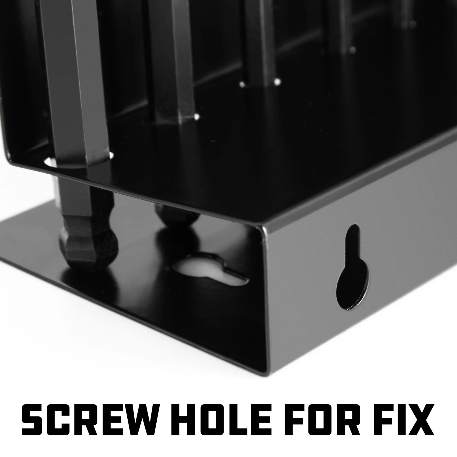 The Powerbuilt 10 Piece SAE T-Handle Hex Key Wrench Set features ergonomic T-handles for comfort, speed, more torque, and durability with precise fit into SAE hex head fasteners. The hex key wrenches are constructed of premium chrome vanadium steel for durability and long tool life. For added versatility, each wrench features a ball end to allow turning hex fasteners from angles up to 25 degrees from vertical. Perfect for odd angles and tight spaces. Wrench set includes sizes 3/32 inch, 7/64 inch, 1/8 inch, 9/64 inch, 5/32 inch, 3/16 inch, 7/32 inch, 1/4 inch, 5/16 inch, and 3/8 inch. Keep the 10 hex key wrenches neatly organized in the included bench or wall mountable enameled steel holder. Wrench sizing is clearly labeled for quick access or inventory. Powerbuilt products meet or exceed ANSI standards. Dependable enough to last a lifetime.