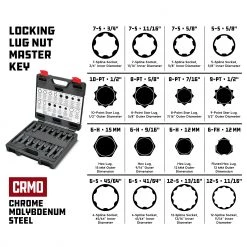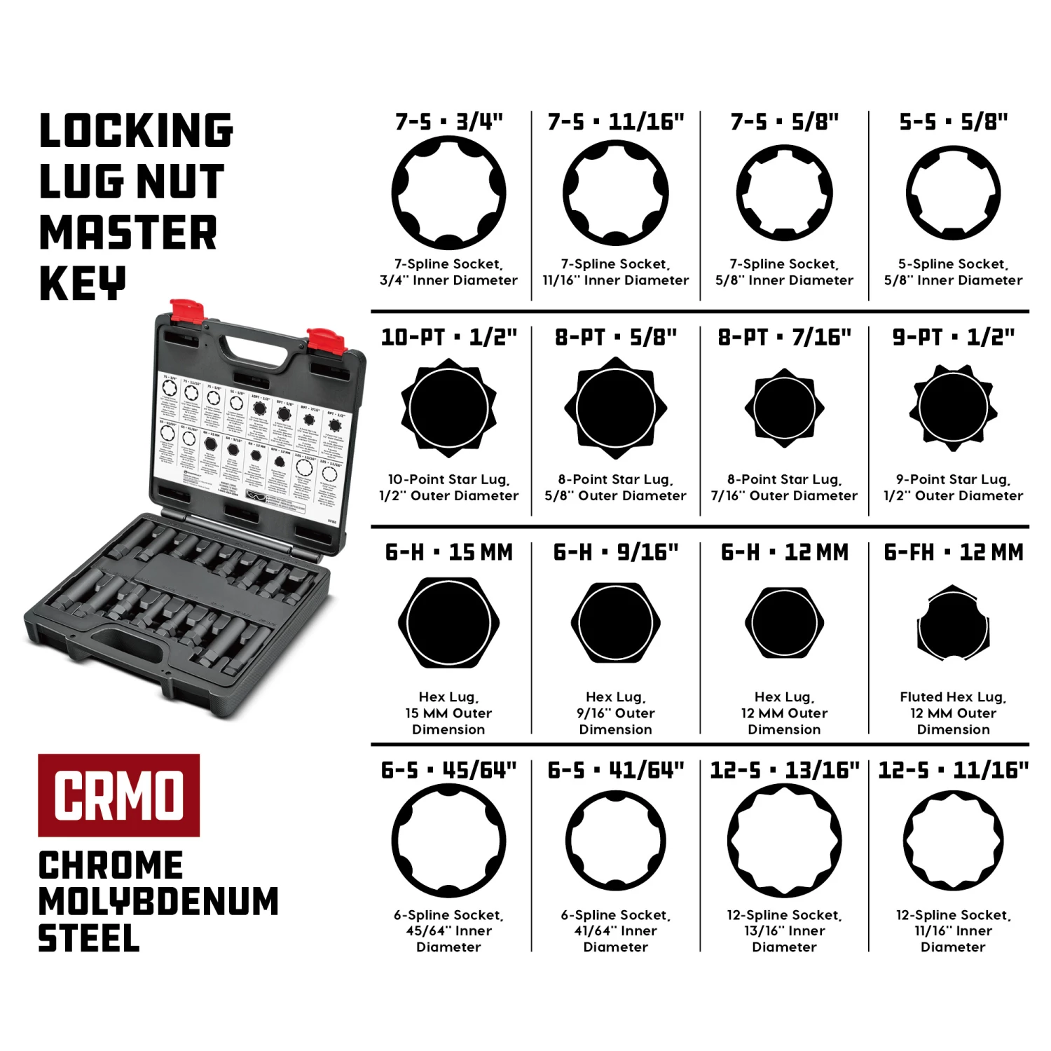 Remove most factory and aftermarket locking lug nuts with this master socket set. Each socket is constructed of impact-rated chromoly steel for use with an impact wrench. each socket is labeled with the size and style of locking lug nut for easy reference. The included storage case makes it easy to keep your sockets safe, clean and organized. And the inside case lid includes a handy socket reference chart.