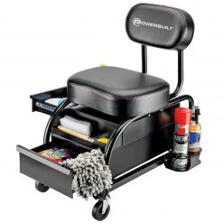 This is one of the most comfortable garage stools that you will ever own. Constructed from heavy-duty steel with 3-inch ball bearing swivel casters and comfortable foam cushion padding on the seat pad and backrest. This comfy beast has a capacity of 500 pounds, strong enough for you and your tools. Comfortable and convenient, your tools are never out of reach, this clever rolling work seat also features 2 slide-out drawers so you can store your basic tools, wash rags, and scrapers on the roller seat as you go. Also includes an open storage tray area for other commonly used cleaners, sprays, and wax you will need to make your automobile look pristine.