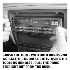 For removing DIN-mounted radios found in Ford, LandRover and Saab vehicles.