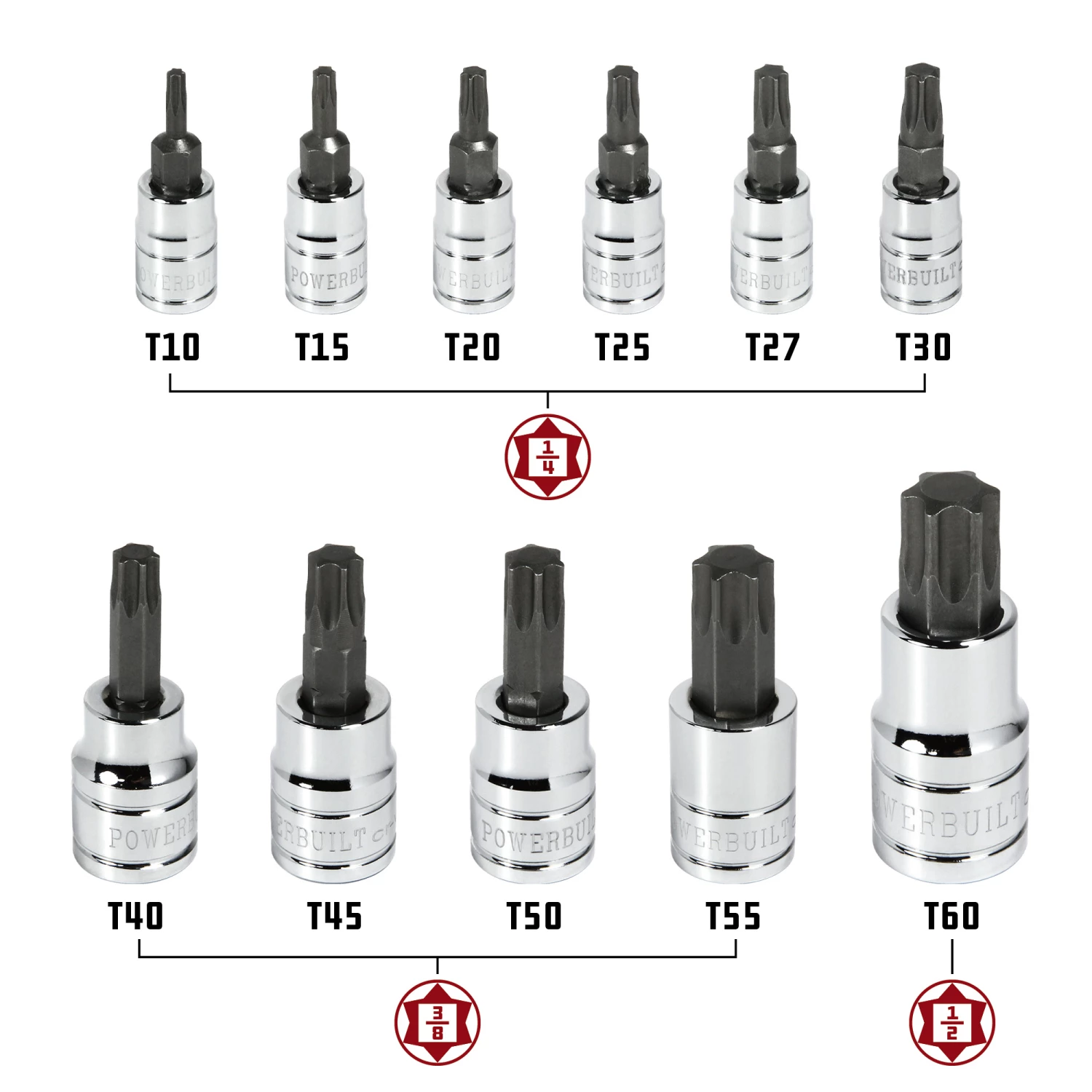 This 12 piece set contains the following Star Torx bit sockets: 1/4-in Drive: T-10, T-15, T-20, T-25, T-27, T-30; 3/8-in Drive r: T-40, T-45, T-50, T-55; 1/2-in Drive: T-60. Meets or exceeds ANSI standards. Lifetime warranty.