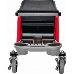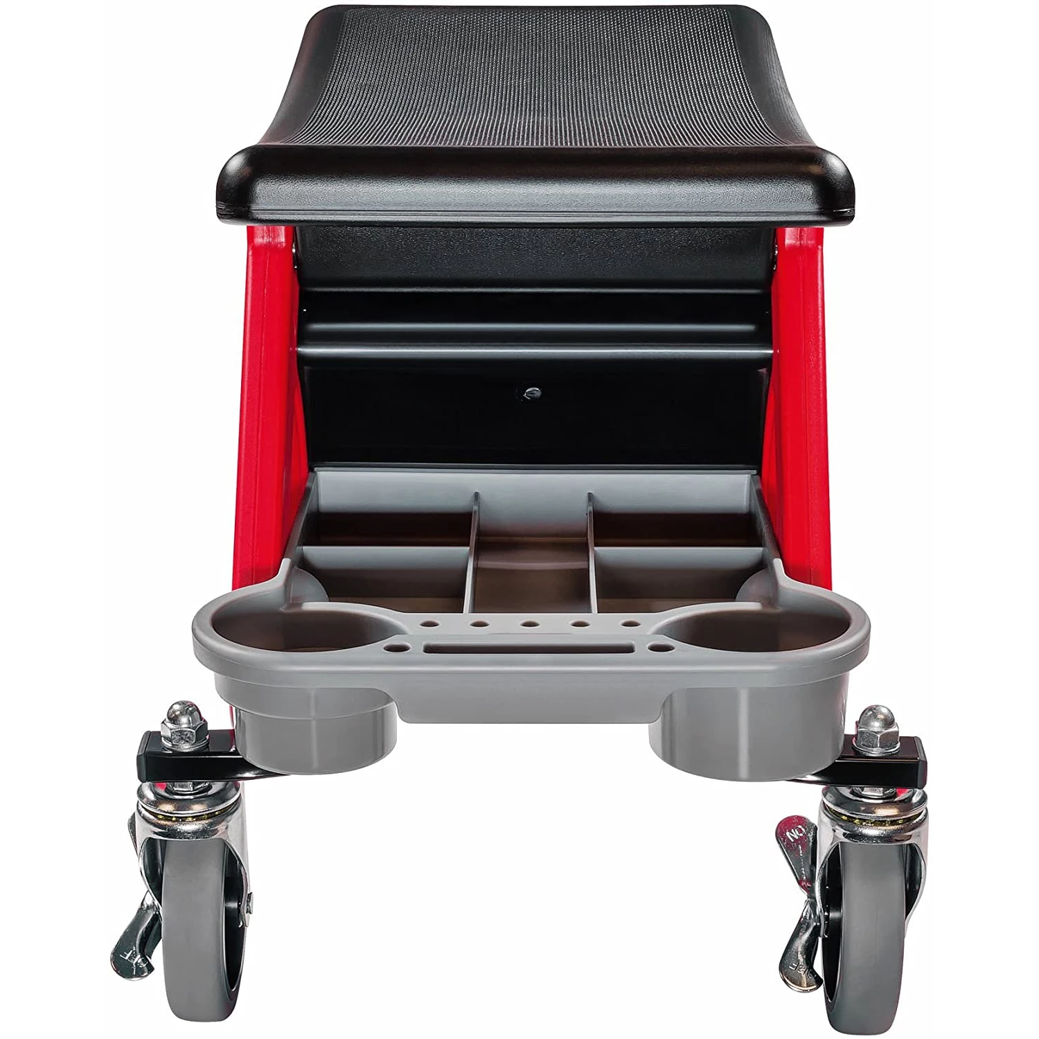 The large lockable 4-inch diameter rubber wheels swivel softly and smoothly over concrete and cracks on ball bearing casters. Its smooth rolling wheels are anchored to a strong and stiff steel frame that spans a full 22-inch length and 12-inch width. The seating storage pod offers a sliding storage bin under the seat surface and 2 handy trays for holding tools, small parts, and up to 4 cans of fluid (cleaners or beverages).