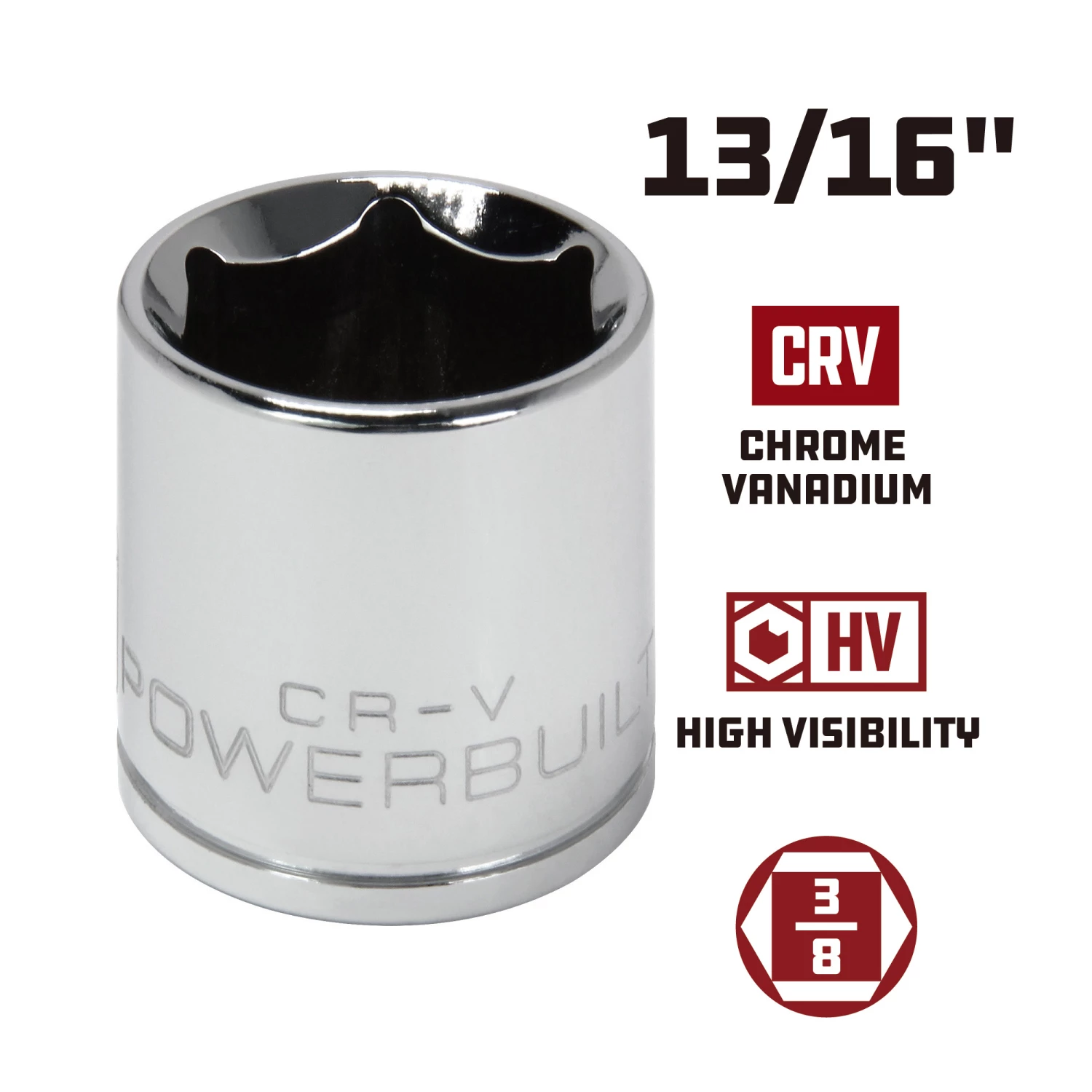 - Powerbuilt chrome sockets feature HV high visibility size markings that are three times larger for easy size selection.