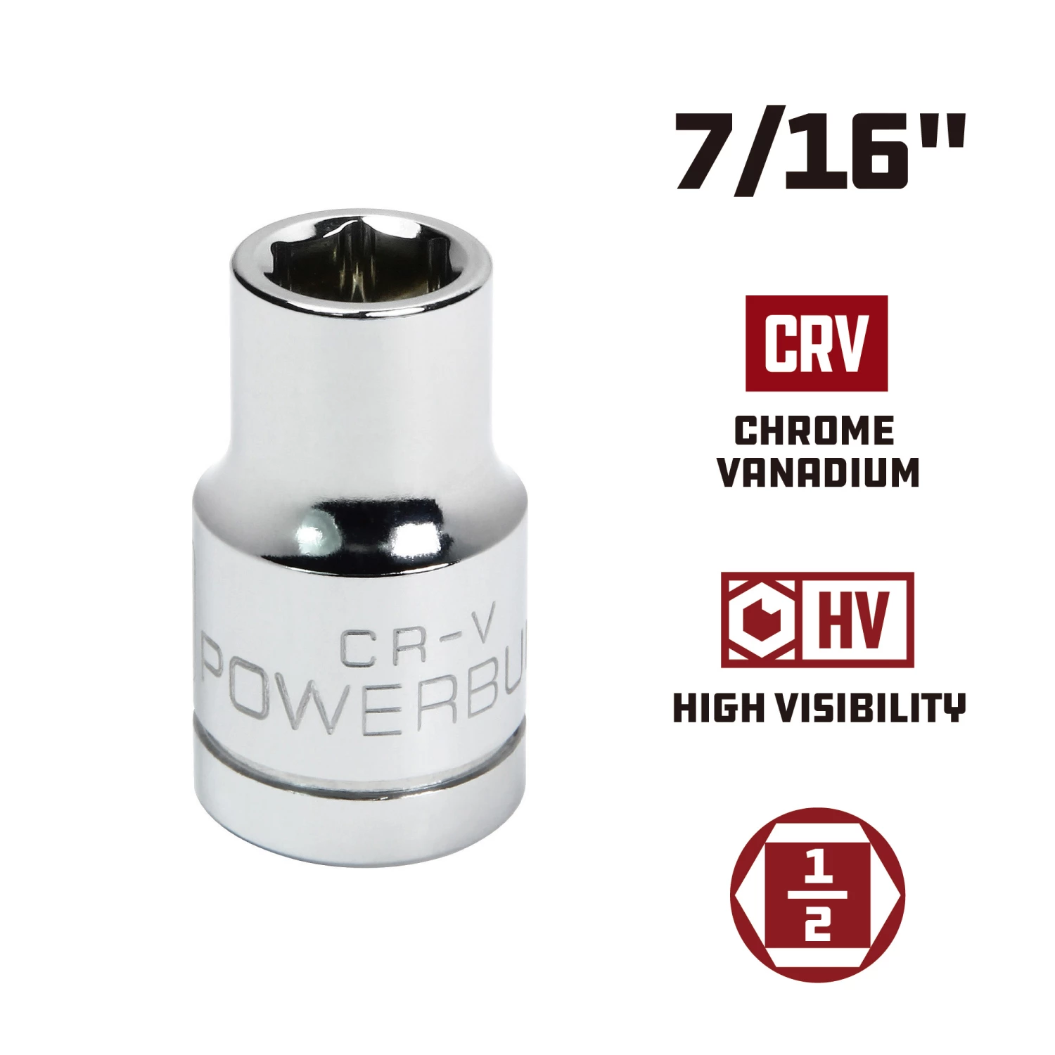 - Powerbuilt chrome sockets feature HV high visibility size markings that are three times larger for easy size selection.