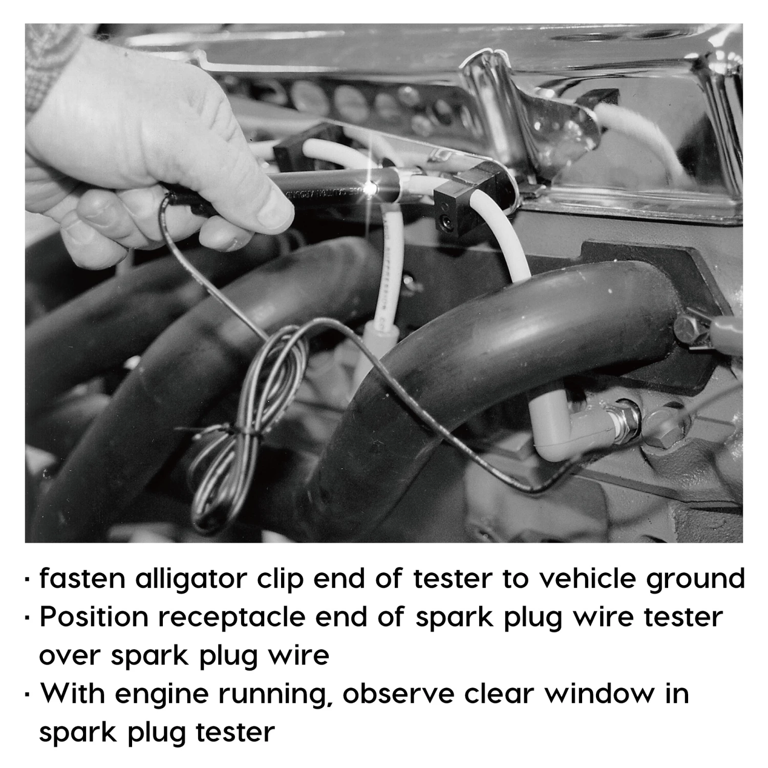 -Fasten alligator clip end of spark plug wire tester to vehicle ground