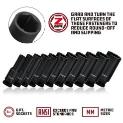- Standard and deep well socket lengths exceed ANSI standards and have the center hole punched through for additional working depth on the work surface.