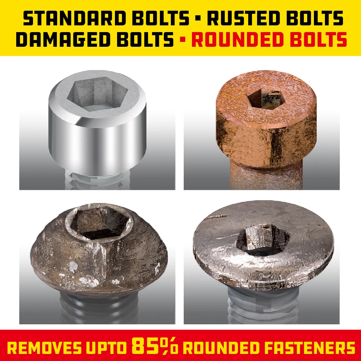 Powerbuilt Zeon hex bit sockets are designed to grip and turn damaged and rounded hex head fasteners. The patented design will grip and turn hex surfaces up to 85% rounded. And they work just as well on new fasteners. If you’ve got a hex head bolt or cap screw bolt that’s too damaged to turn with a regular hex bit socket or hex key wrench that you can’t turn or a nut with rounded corners, we have the help you need. The secret is the patented Zeon bit socket design – the more you turn them the harder they grab and hold damaged hex heads. Zeon bit sockets are constructed of hardened S-2 Chromoly steel for maximum strength and durability.