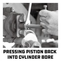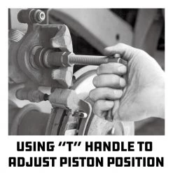 The kit includes a center screw and “T” handle, plate, disc and adapters to work with most disc brake calipers, including rear calipers on vehicles with self-adjusting parking brakes.