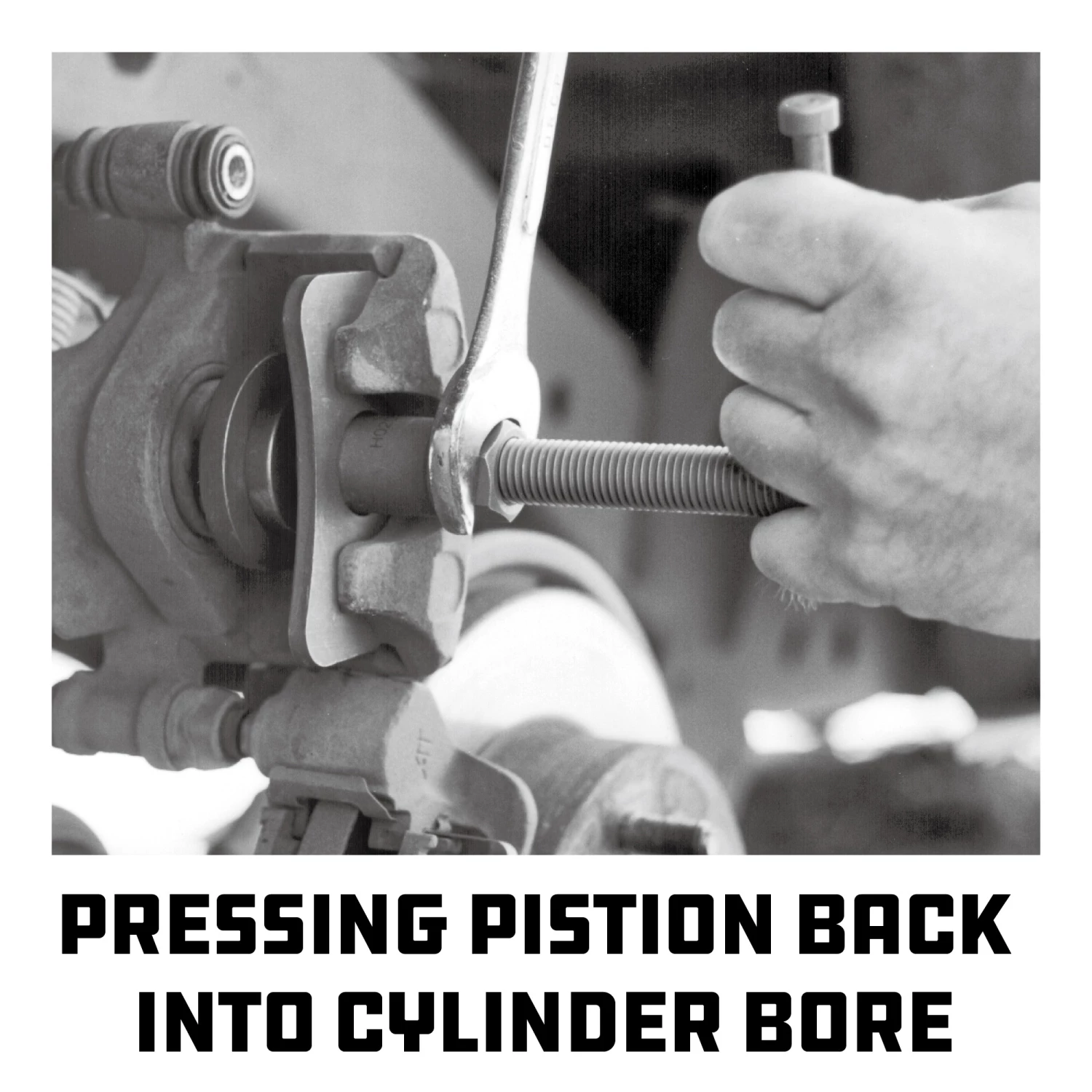 For disc brake caliper piston adjustment. This dual-purpose tool can be used to adjust the piston position by screwing it into or out of the cylinder bore, and to push piston straight back in the cylinder bore.