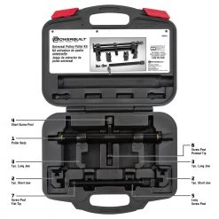 Universal Pulley Puller Kit is like nothing else on the market. Brand new designed by Powerbuilt tools this pulley puller has the most versatility in function and application than any other puller on the market. From the center point adjustability of the jaws to the various long and short post and jaw arm adapters this puller virtually can work on almost any Domestic or Foreign engine pulley application. Kit includes a heavy duty carry case with usage photos and detailed instructions.