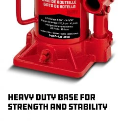 This tough 12-ton bottle jack has a strong forged iron saddle with a lifting range of 8-5/8 to 16-1/4 inches. The stable oversized cast iron base helps prevent tipping. A dependable cast iron handle socket adds strength and durability. Once your repairs are done, turn the precision pin type release valve to lower.