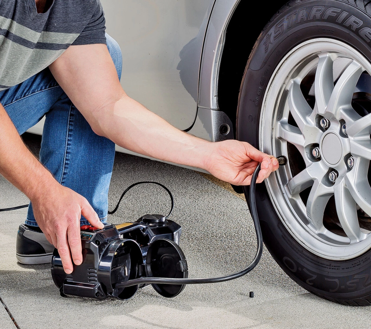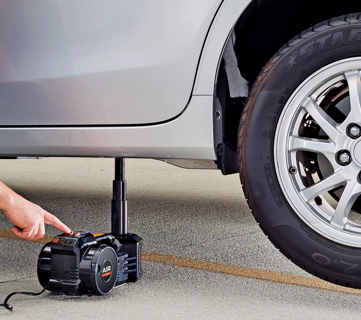 Nothing spoils a road trip faster than a flat tire. When roadside service can’t get there soon enough, reach for the Powerbuilt 12V Electric Jack and Tire Inflator. Just position it under your vehicle lift point, plug it into a 12V outlet, and press the button. Like magic, the lifting post extends and raises your vehicle up to 14 inches high. With a 1-ton lift capacity, it has more than enough power to lift one side of almost any passenger vehicle. And if your spare tire is low on air, just use the built-in 115 PSI inflator to air it up to proper pressure.