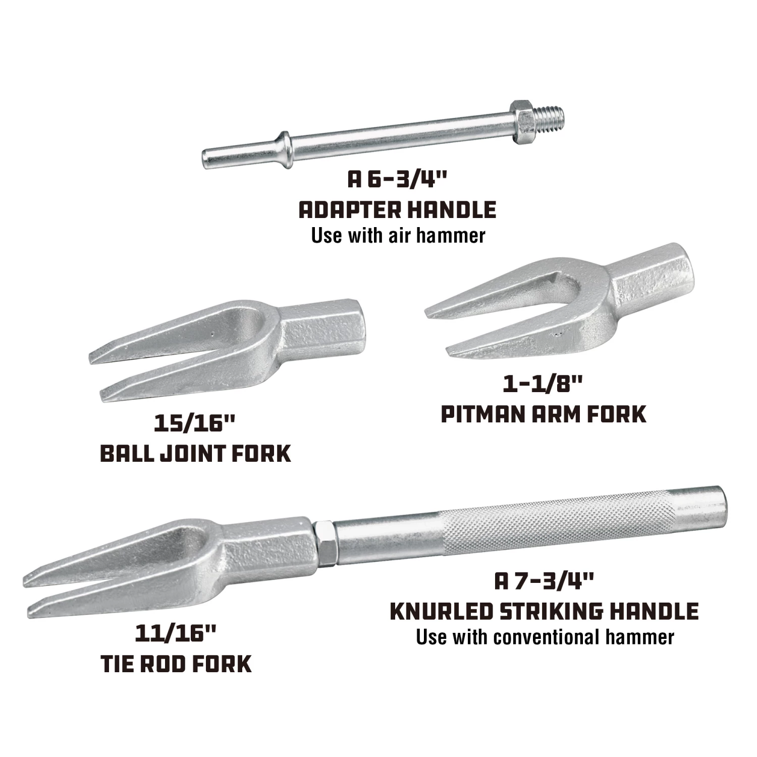 Make front-end servicing easier with the Powerbuilt 5 Piece Front-End Fork Set. Designed to make quick, easy work of separating stubborn tie rods, ball joints, and pitman arms on most passenger vehicles. Simply select the right heavy-duty steel fork for your job, place the fork, and give it some muscle, a whack, or hit it with an air tool. Kit contains 1-1/8 inch pitman arm fork, 15/16 inch ball joint fork, and 11/16 inch tie rod fork. All forks are threaded to interchange with either handle. A 7-3/4 inches knurled striking handle is included for use with conventional hammers. A 6-3/4 inch adapter handle is included for use with air hammers. Kit Includes heavy-duty carry case with usage photos and detailed instructions.