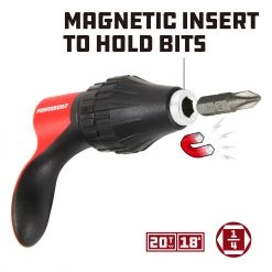 This compact, versatile and speedy finger ratchet fits where full-size ratchets won’t and works faster too! It offers speed, compact size and a stylish red anodized finish. Simply attach 1/4″ hex screwdriver bit then tighten or loosen a fastener with the sturdy 20 tooth ratchet mechanism. Precision-built and affordable, Powerbuilt products meet or exceed ANSI standards.