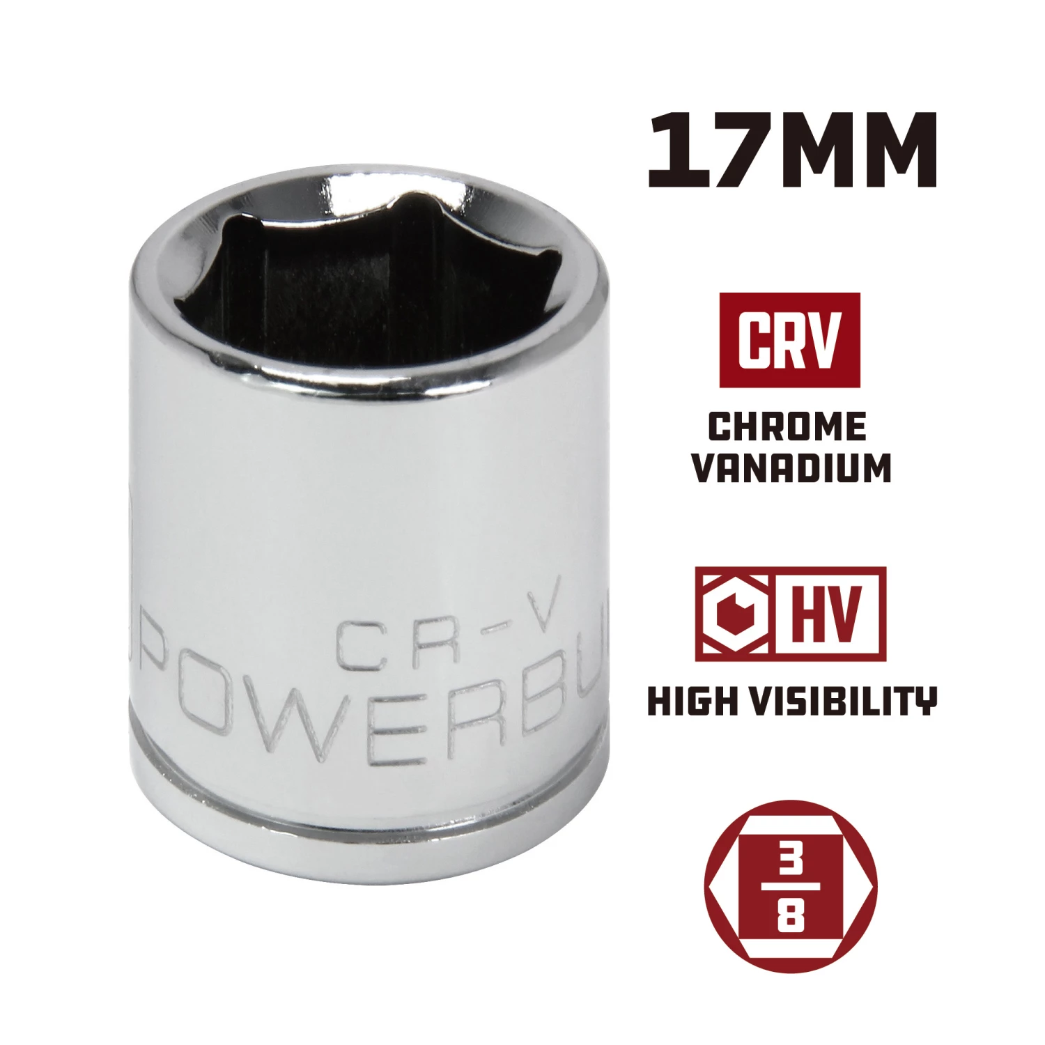 - Powerbuilt chrome sockets feature HV high visibility size markings that are three times larger for easy size selection.