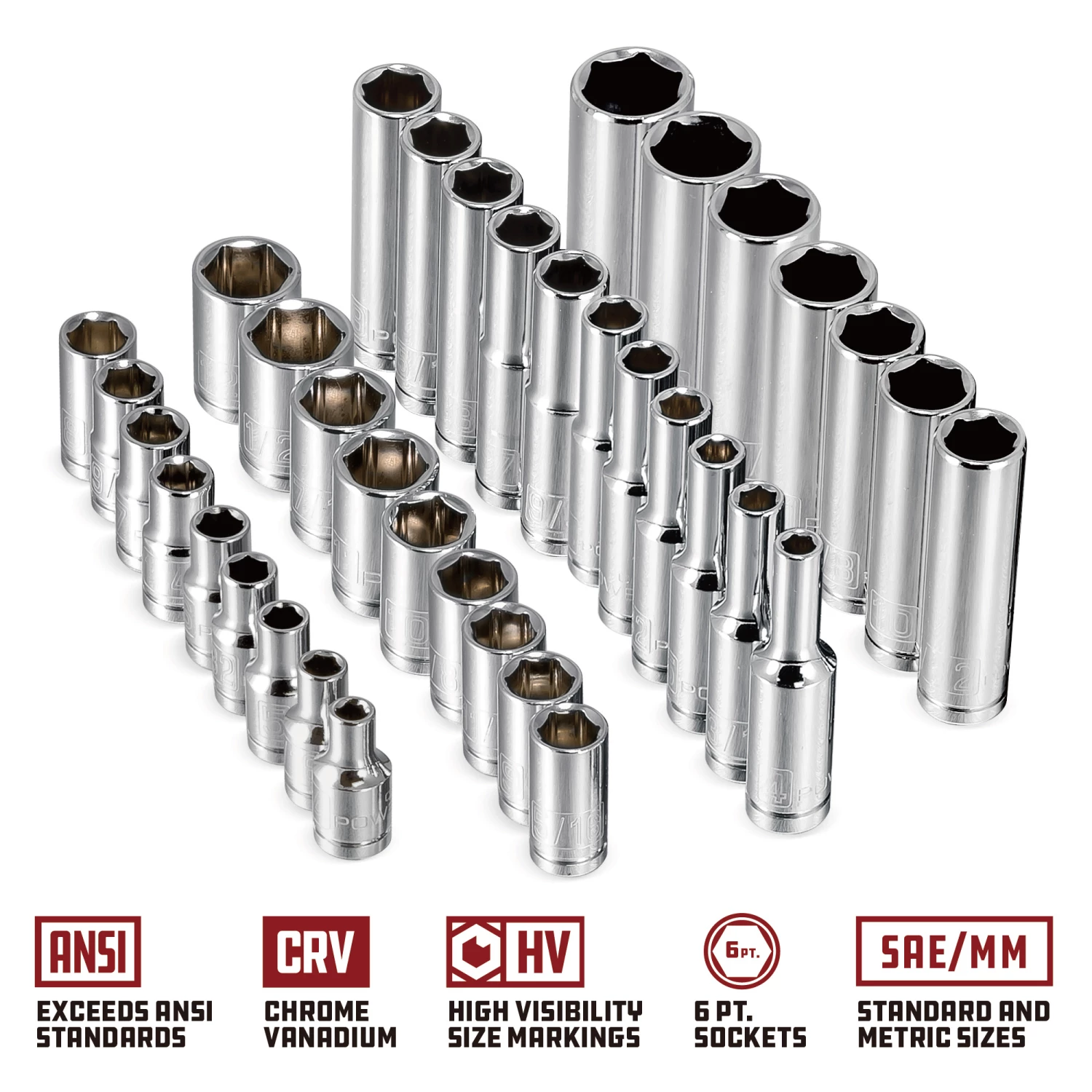 Master mechanics and hobbyists alike demand their tools have the highest quality materials and precision manufacturing. With this in mind, Powerbuilt created the 38-Piece 1/4 inch Drive Mechanics Tool Set. All tools are made from professional-grade materials and designed and produced with the precision and quality required of professional mechanics. The Mechanics tool set includes a robust selection of common-sized sockets in shallow and deep styles in both SAE and metric sizes. A 72 toothed sealed head ratchet with a 5-degree swing for smooth action and better torque in those hard-to-reach spaces. And a 2-inch extension bar to further extend the reach in tight spaces. Made from Chrome Vanadium (Cr-V) steel, with mirror polished plated finish for durability, and corrosion resistance these tools are assured a long tool life. This set comes in a protective heavy-duty blow mold carry case for easy organization and transportation of tools.