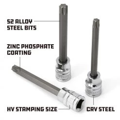 For automotive star fasteners. 6-in length for added reach. Includes T-40, T-45, T-47, T-50 bits. Premium S2 alloy steel bit and CRV socket. Meets or exceeds ANSI standards. Lifetime warranty.