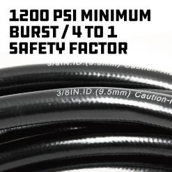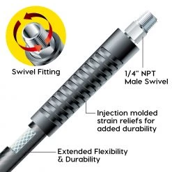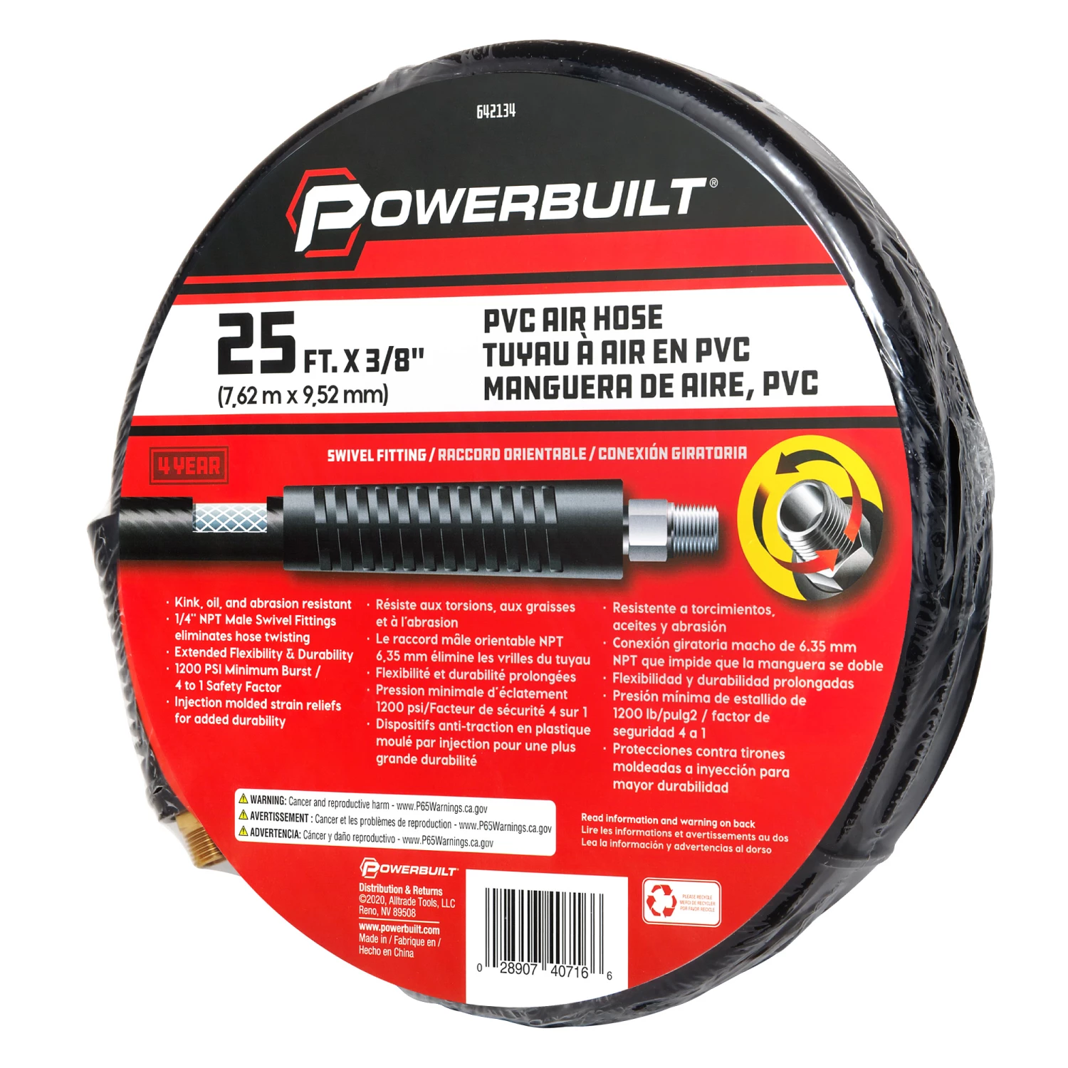 Compressed air can be one of the biggest assets when working on various projects. Whether a professional or do it yourself at home, working with air tools, or simply filling a flat tire, a quality air hose is a must. That’s why Powerbuilt designed the 25 Foot x 3/8 Inch PVC Air Hose. This PVC air hose is built tough to provide years of service in the garage, shop and jobsite. The PVC is lightweight but tough, built to resist fluid damage, abrasion, and stays flexible in low temperatures. The hose features 1/4-inch swivel NPT male fittings on both ends to prevent tangling or kinking the hose. The air hose has a working pressure of up to 300 psi.