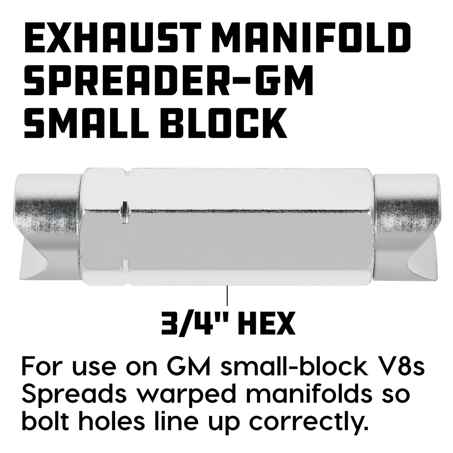 Spreads warped manifolds on GM small-block V8s and V6s so that bolt holes line up correctly. Uses 3/4-in hex wrench. Can be used in pairs. Meets or exceeds ANSI standards. Lifetime warranty.