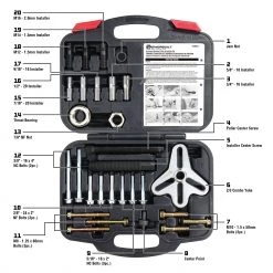 For removing and installing harmonic balancers that have threaded holes. For removing balancers, kit contains 2/3 combo yoke, 5/8-in x 5/8-in national fine center screw, center point piece, and the following bolt pairs: 3/8-in-16×4-in national coarse, 3/8-in-24×2-in national fine, 5/16-in-18×2-in national coarse, M8-1.25x80mm and M10-1.5x50mm. For installing balancers, kit contains 7/8-inx4-1/4-in national fine center screw, thrust bearing, forcing nut, jaw nut and the following adapters: M12-1.5, M14-1.5, M16-2.0, 7/16-in- 20, 1/2-in-20, 9/16-in-18, 3/4-in-16. Storage case complete with laminated instruction sheets with photos. Meets or exceeds ANSI standards. Lifetime warranty.