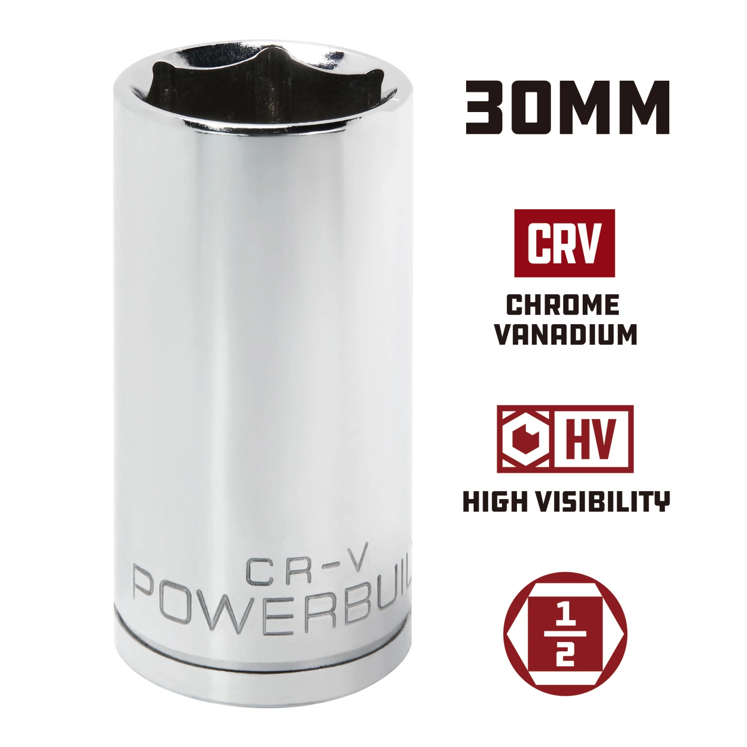 When you need professional quality fit and finish, you need the Powerbuilt 1/2 Inch Drive 30 MM 6 Point Deep Socket. Powerbuilt sockets are made from high-grade chrome vanadium steel and feature a mirror-polished chrome-plated finish for superior durability and corrosion resistance. The 30mm socket is cold forged, heat treated and produced with precision tolerances. The socket also features oversized high visibility size marking for easier recognition. The socket has chamfered edge for easier and stronger mating to fasteners. All Powerbuilt sockets exceed ANSI standards for quality and durability.
