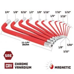 This top quality long arm SAE hex key wrench set offers strength, style and precision. Each wrench is constructed of premium chrome vanadium steel for durability and precise fit into SAE hex head fasteners. A durable powdercoat finish adds protection and color-coding while the ball end drives fasteners from angles up to 25 degrees from vertical. And the wrench ends are magnetized for easier fastener start up and removal.