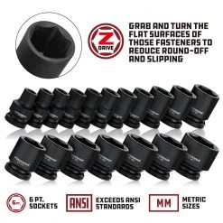Powerbuilt Impact Sockets and accessories feature an industrial grade Black Phosphate finish that prevents corrosion and extends the life of the tool. Each socket is made from impact-rated Chrome Molybdenum Steel material for added durability with laser-engraved size marking that won’t rust or wear off – ever. Precision chamfered hex faces make it easier to guide onto fasteners and the exclusive Z-Drive 6 point hex pattern grabs and turns the flat surfaces of those fasteners to reduce round-off and slipping. Finally, socket center holes are punched through to add a bit more clearance for taller nuts and bolts. Powerbuilt impact socket and accessories offer the look, feel and performance hard-working Techs deserve and exceed ANSI standards for performance and quality.