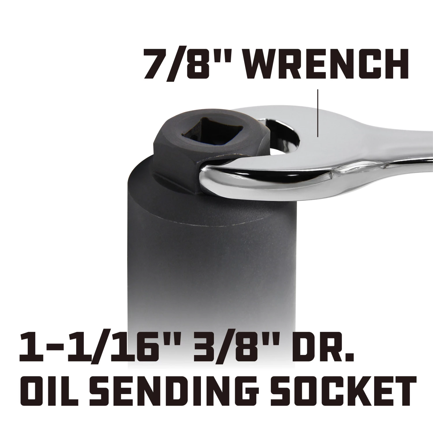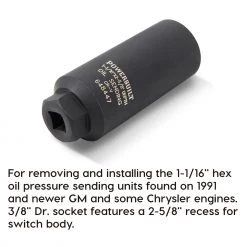 For removing and installing the 1-1/16-in hex oil pressure sending units found on 1991 and newer GM and some Chrysler engines. 3/8-in drive socket features a 2-5/8-in recess for switch body. Socket can also be turned with a 7/8-in end wrench on the external hex. Chrome vanadium steel for strength. Meets or exceeds ANSI standards. Lifetime warranty.