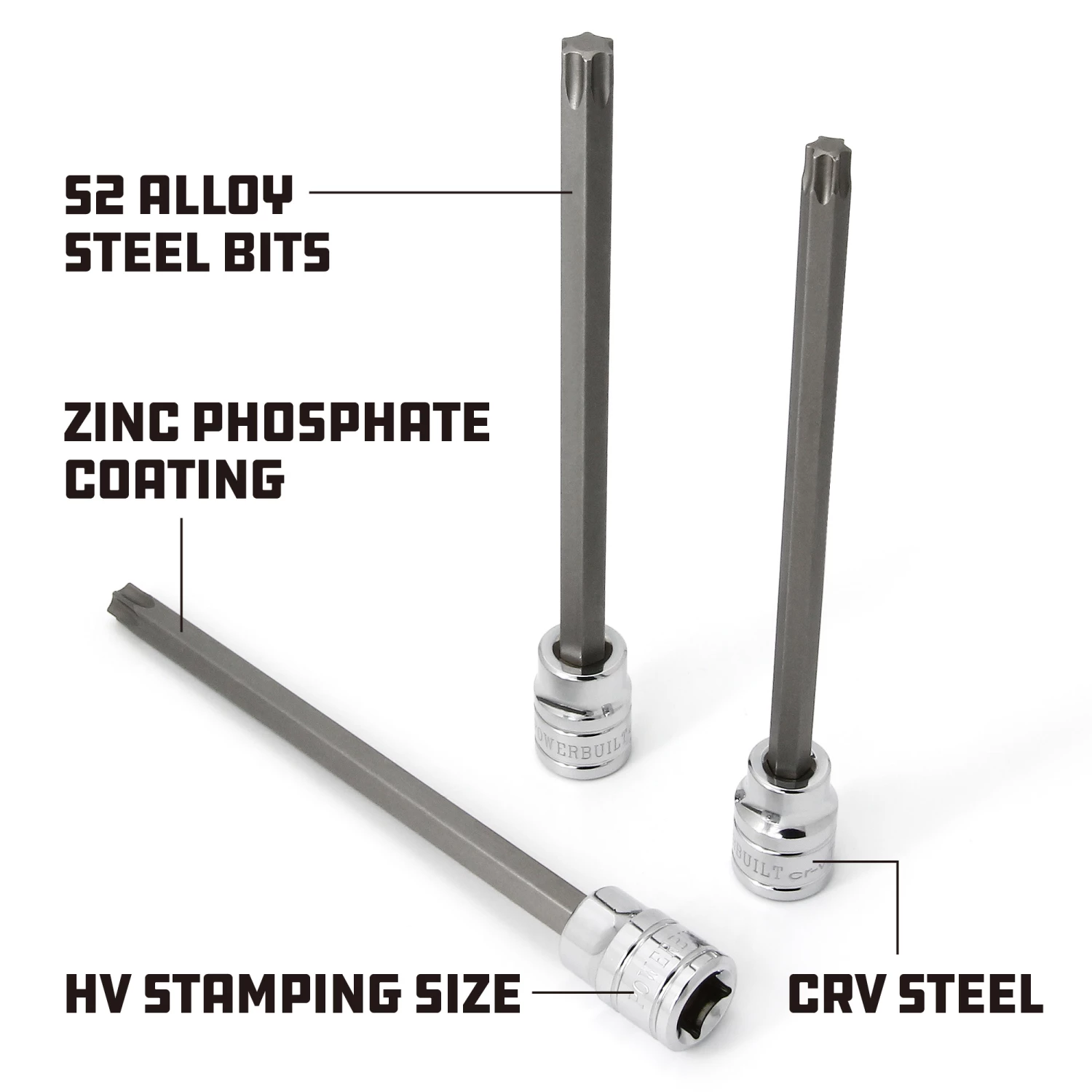 This high-quality 6-inch long bit set offers a useful combination of extra-long Star bit sockets for servicing brake system components that are hard to reach Includes 3/8-inch Dr. T-40, T-45, T-47, T-50 bits sockets with 6-inch overall length Sockets feature chrome vanadium construction with chromoly steel S-2 bitsIncludes metal socket clip Meets or exceeds ANSI standards Lifetime factory warranty