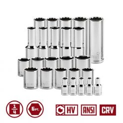 Powerbuilt Professional Technician socket sets are built to meet or exceed ANSI specifications. All sockets, socket accessories and drive tools are constructed of high-quality Chrome Vanadium (CR-V) steel with mirror polished chrome plated finish. Powerbuilt sockets are the heart of these sets. Their sleek chrome finish is enhanced with an easy to read size marking that is forged into the metal. Because it’s forged into the socket wall, the marking won’t rust or wear off – ever. Beauty is more than skin-deep though. Inside Powerbuilt sockets you’ll find precision chamfered hex faces that make it easier to guide them onto fasteners. And the exclusive Z-Drive hex pattern grabs and turns the flat surfaces of those fasteners to reduce round-off and slipping. Finally, the center holes are punched through to add a bit more clearance for taller nuts and bolts. Each socket is mirror polished and chrome plated for the highest degree of durability and corrosion resistance. Powerful, precise and stylish, Powerbuilt socket sets offer the look, feel and performance hard-working Techs deserve.