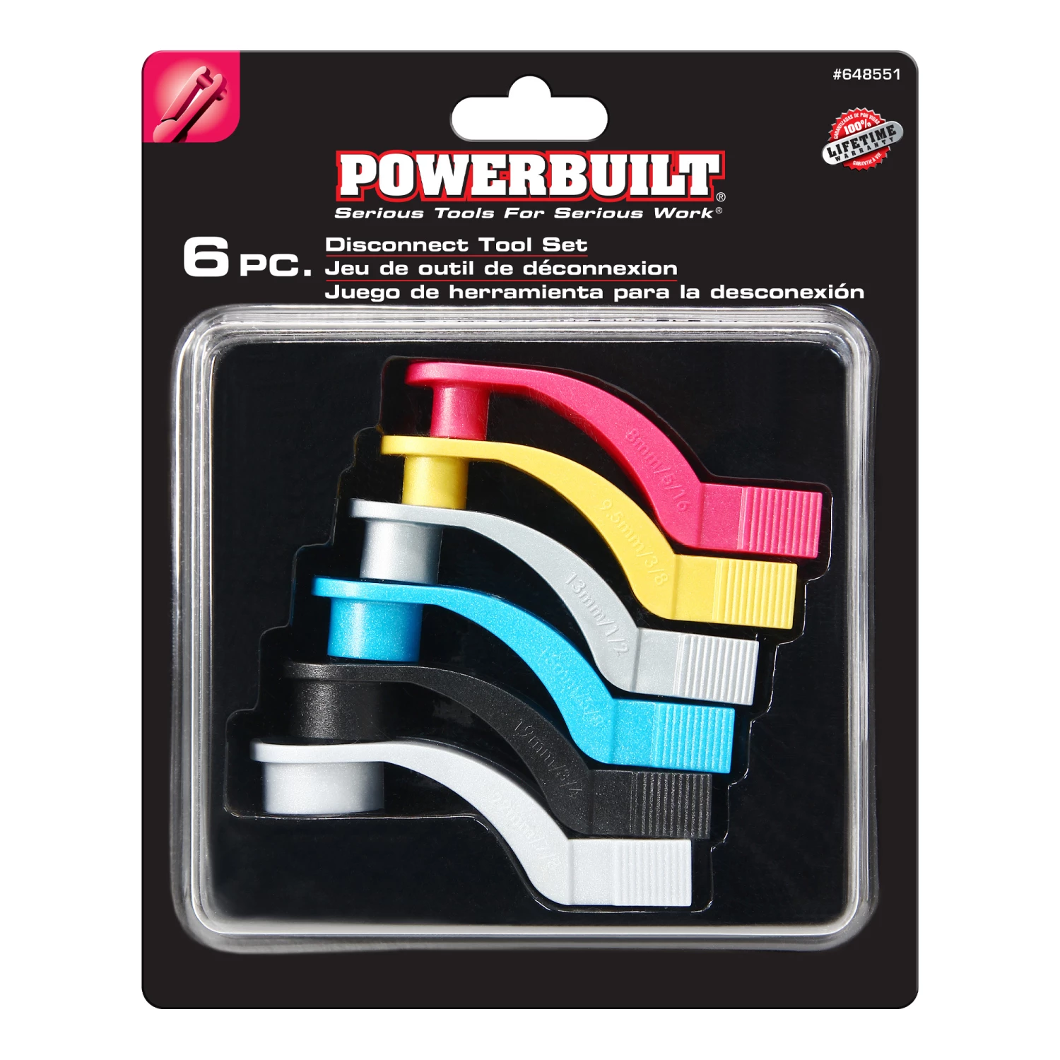 The Powerbuilt 6 Piece Disconnect Set separates fittings on fuel lines, fuel filters, and fuel tank return lines. An oil cooler line disconnect tool separates automatic transmission oil cooler lines..