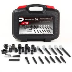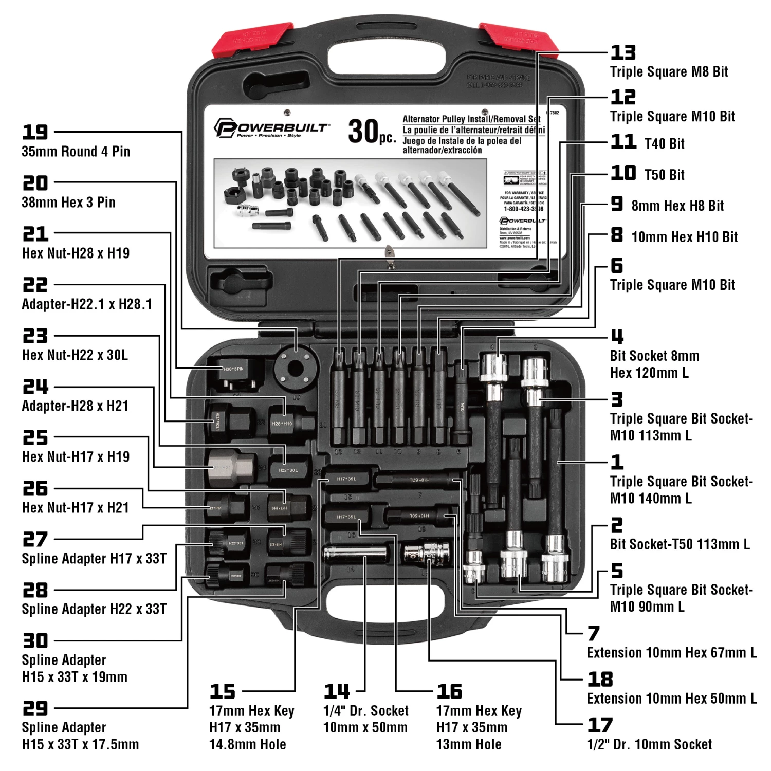 The Powerbuilt Alternator Pulley Removal and Installer Kit is designed for quick, safe removal or installation of “Press Type” alternator pulleys without damaging components during service. This handy 30-piece kit fits most of today’s press-type alternator pulley systems. Kit contains a wide selection of the most popular adapters for a wide coverage of vehicles. Kit includes a heavy-duty blow-molded storage case, usage photos, and detailed operating instructions.