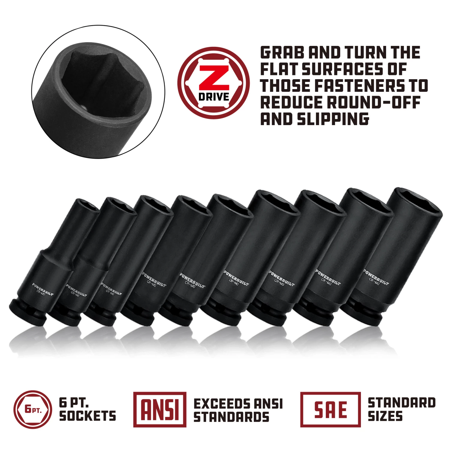 - Finally Powerbuilt sockets feature Z-Drive®, contacting the flat walls of fasteners for stronger grip.