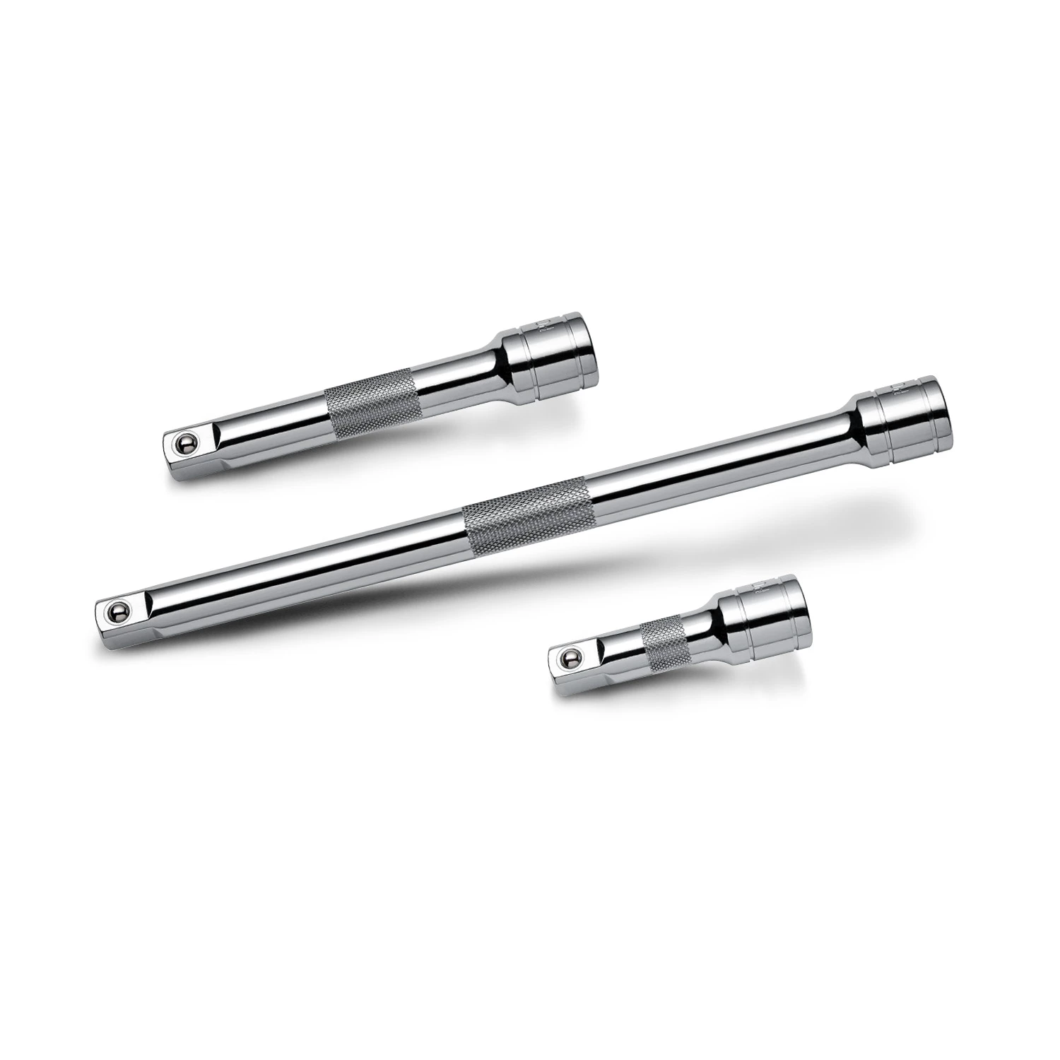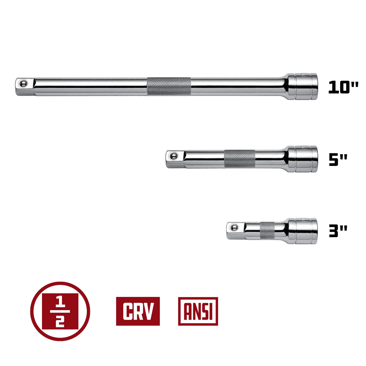 The Powerbuilt 3 Piece 1/2 Inch Drive Socket Extension Bar Set is the perfect socket extension set. Three-piece extension bars set come with 3 inches, 5 inches, and 10 inches, to maximize coverage. They are made from high-quality Chrome Vanadium steel with a mirror-polished chrome-plated finish for durability and long tool life. This 3 piece set of extensions are perfect solution tools for when accessing hard-to-reach places like when working in and around engines, under the chassis, or any other jobs that require a long reach in a tight space. Each extension features knurling on the center of the shaft for a secure grip to allow for quicker rotation when tightening or loosening fasteners. No need to worry about dropping sockets in small spaces the Powerbuilt extensions also feature spring-loaded detent balls to help lock into and secure the sockets.