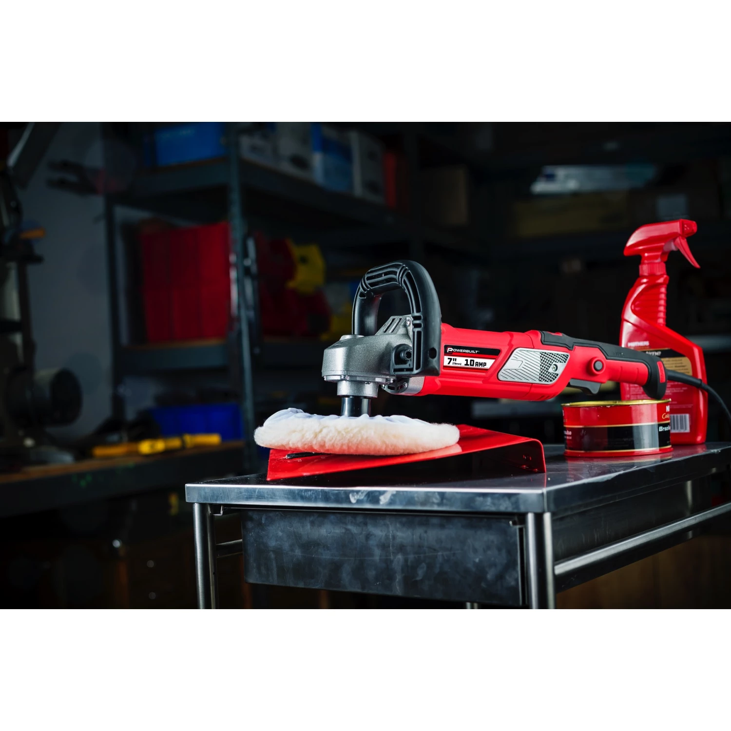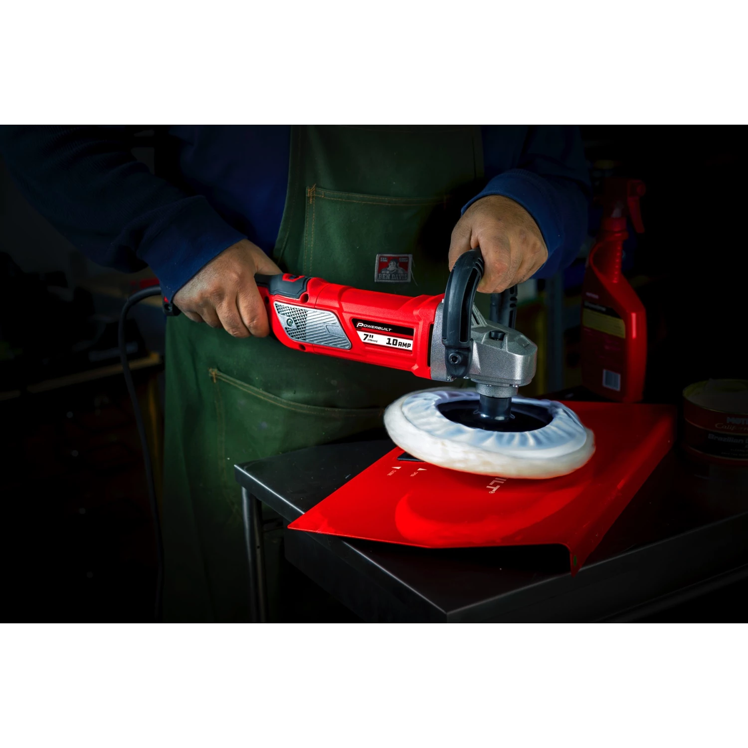 The Powerbuilt 7-inch sander and polisher offers features and performance to delight car detailers, wood and stone craftsman and anyone looking for speed, precision and control. The powerful 10 Amp motor offers heavy-duty performance for continuous use. A six position electronic variable speed control lets you match the output and RPM to the application for greater control. A composite body reduces weight, while the TPE coated handle adds grip and mutes vibrations. A D-loop handle provides control, comfort and balance, and is reversible for Southpaws. The 7-inch polisher sander comes complete with a wool polishing bonnet and a hook and loop backer disc. There’s even a spare set of motor brushes.